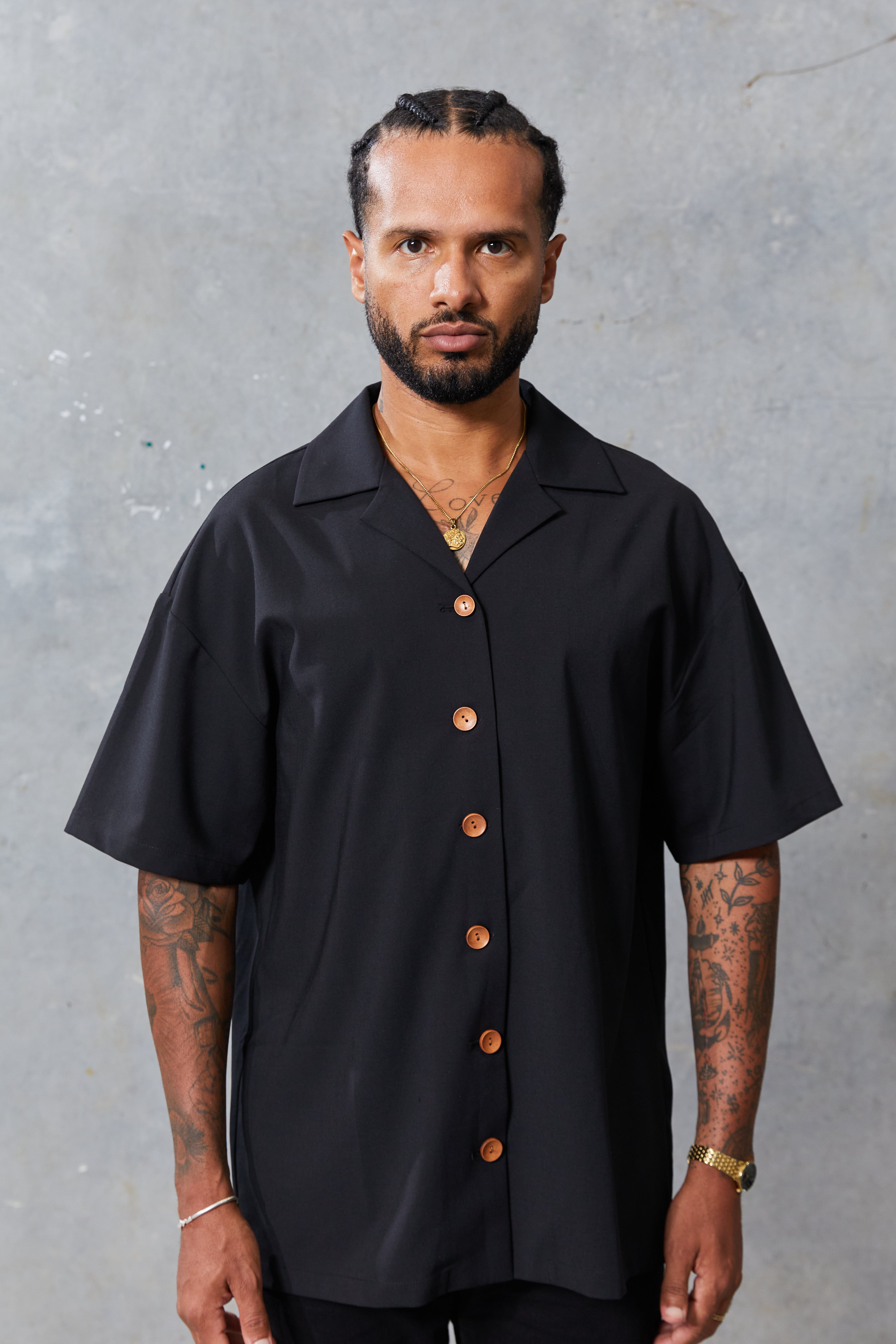 Enhance your casual wardrobe with our Jon Button-Up Oversized shirt in black, featuring wooden buttons. Made from a luxurious 180 GSM viscose fabric that ensures both comfort and style. V-neck for a modern look Wooden buttons Crafted from 100% viscose Oversized fit for a relaxed and contempo...