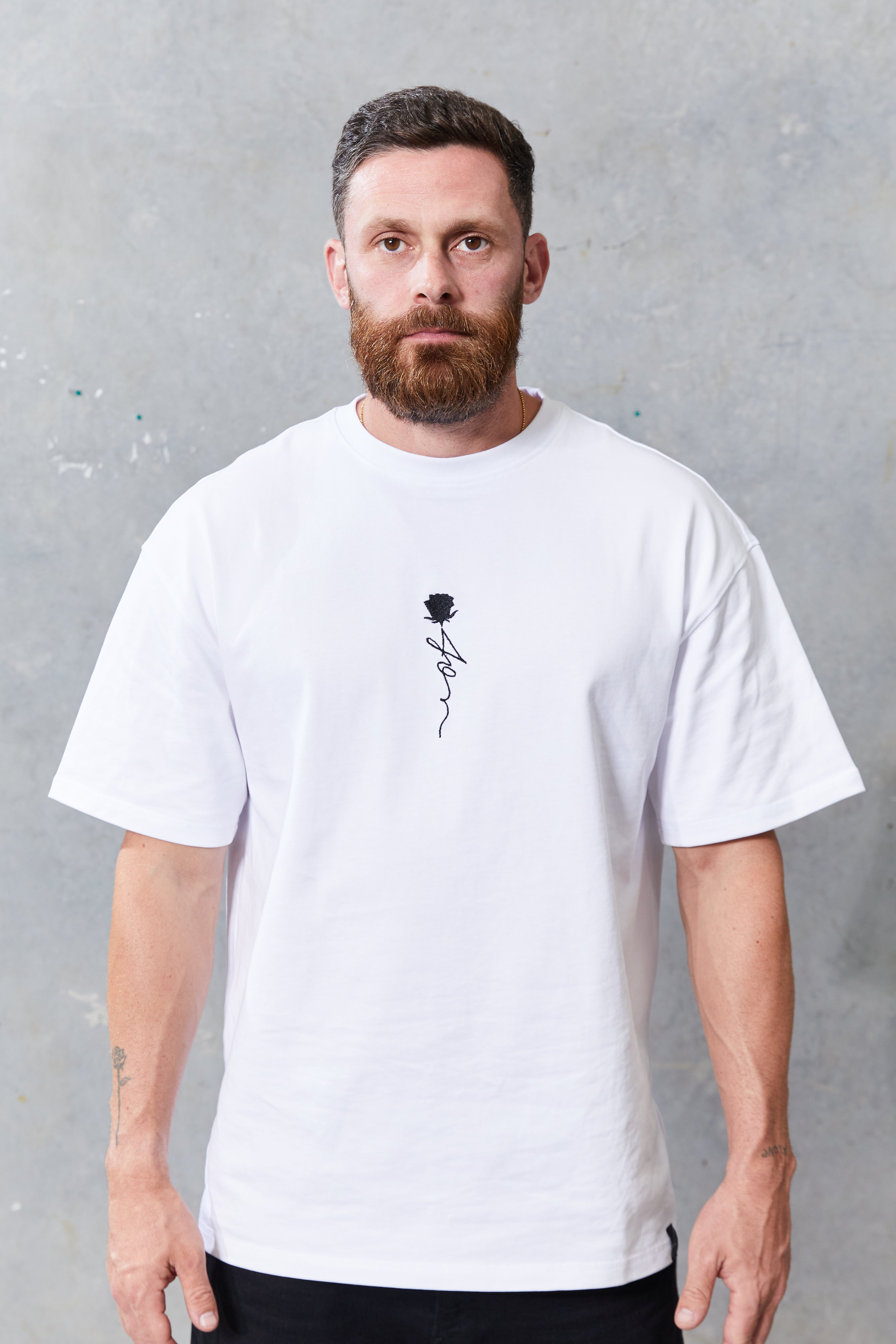 Elevate your casual wardrobe with our Jon Oversized White T-shirt featuring a unique black rose Jon logo embroidered on the chest. Made from a luxurious 300 GSM heavyweight fabric that ensures both comfort and durability. Round neckline for a classic look Embroidered Jon logo Crafted from ...